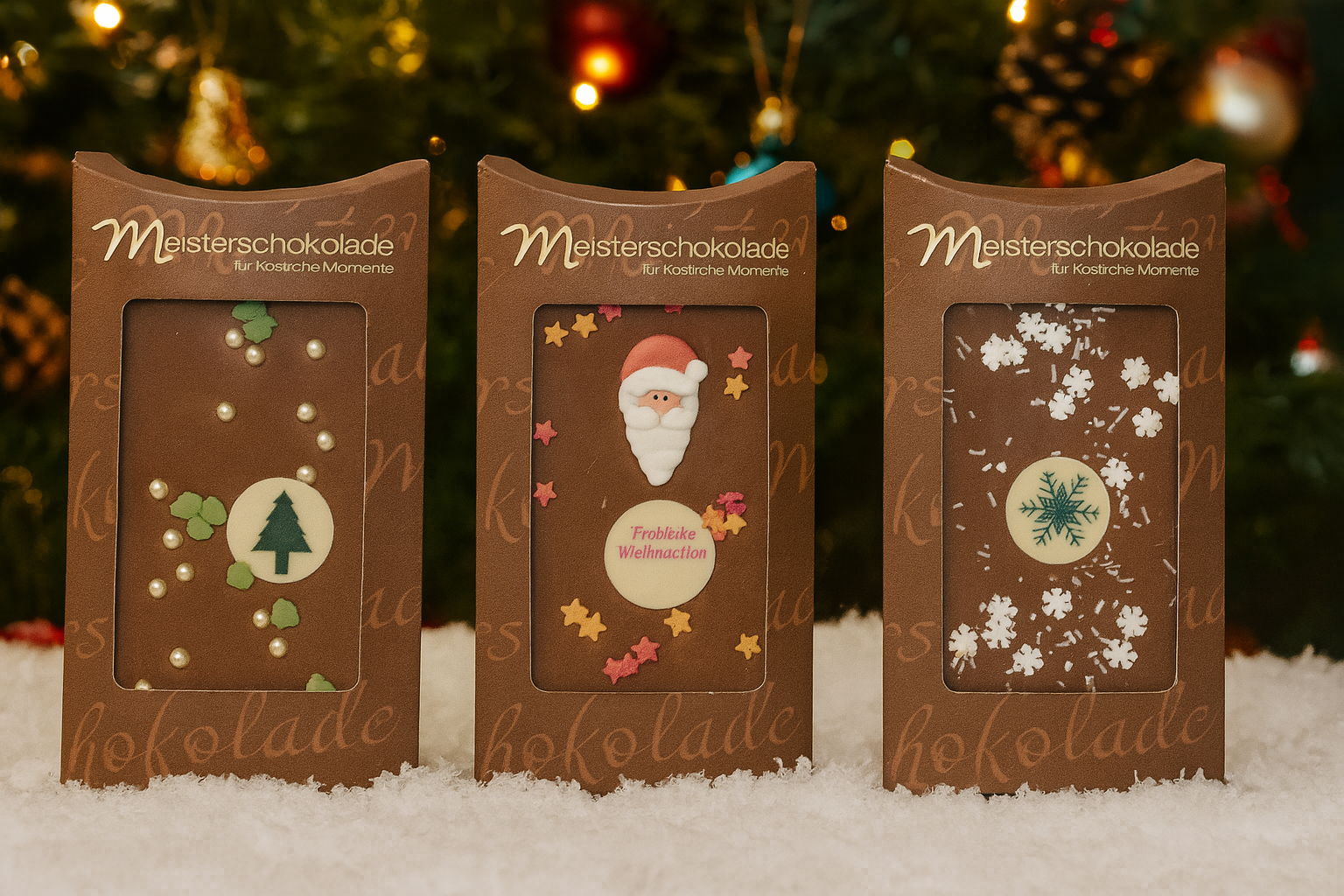 Tauche ein in die zauberhafte Welt der Weihnachtsfreude mit unseren drei liebevoll dekorierten Vollmilchschokoladen – jede ein kleines Kunstwerk, das Geschichten erzählt: