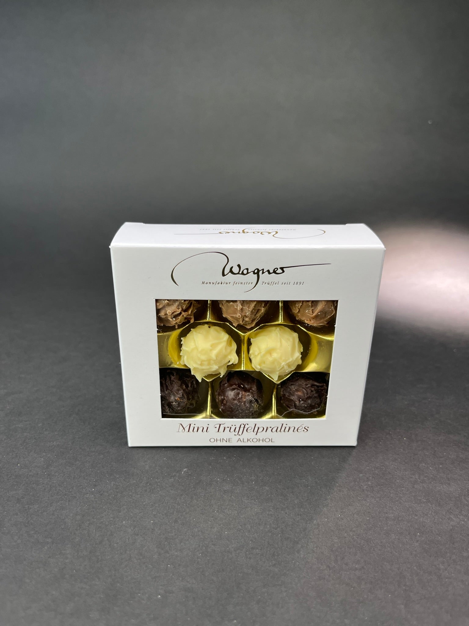 Trüffelpralinenmischung (45 g) in Zartbitterschokolade (Kakao: 60 % mindestens), Vollmilchschokolade (Kakao: 35 % mindestens) und Weißer Schokolade (Kakao: 29 % mindestens) ohne Alkohol