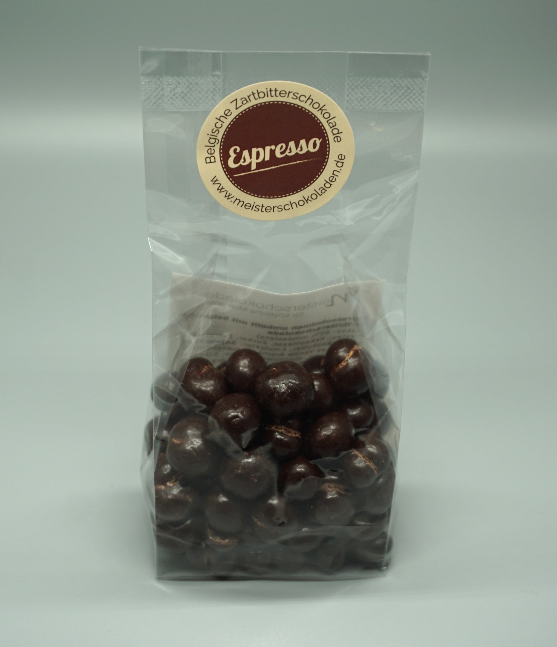 Zutaten: Kakaomasse, Zucker, Espressobohnen, Kakaobutter, Emulgator: Sojalecithin, E476; natürliches Vanille Aroma, Überzugsmittel: Glukosesirup, modifizierte Stärke, Schellack.