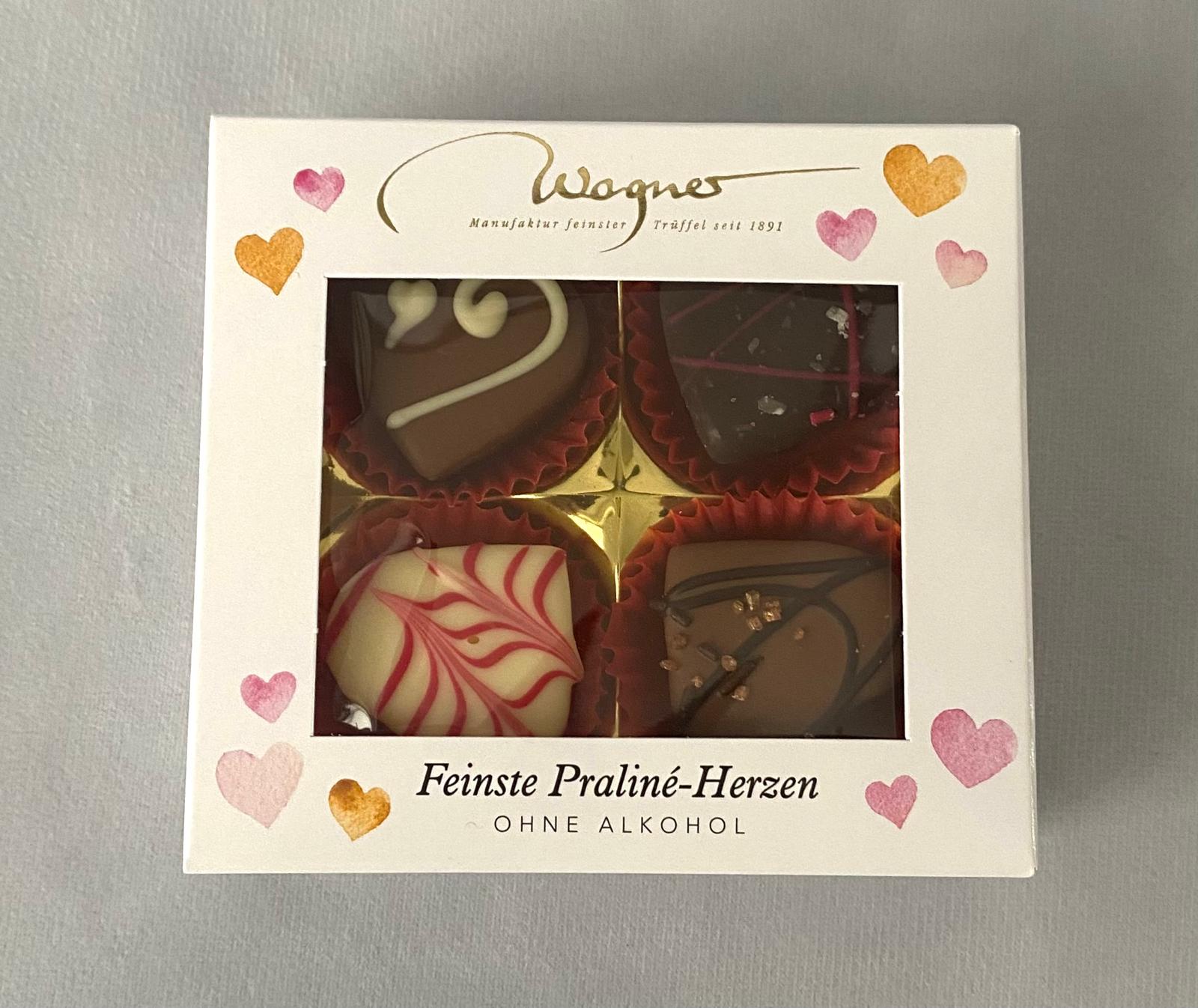 Feinste Praline-Herzen - mit Liebe handgegossen, gefüllt und verziert, kunstvoll dekorierte Einzelstücke, Inhalt: 45g